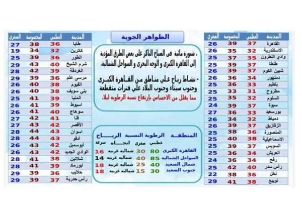 القاهرة 37:25 الأسكندرية 32:26، أسوان 43:28، سوهاج 40:26، أسيوط 39:26، الأقصر 42:27، حلايب 36:29، الوادي الجديد 42:26، سيوة 37:24.