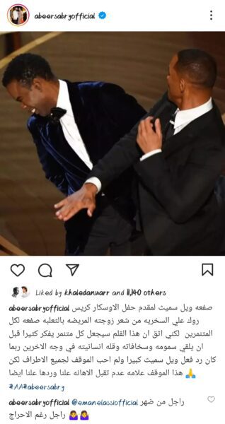 دعمت الفنانة “عبير صبري” الفنان العالمي “ويل سميث” في أزمته الأخيرة، عبر حسابها الشخصي بموقع تبادل الصور والفيديوهات الإنستجرام.